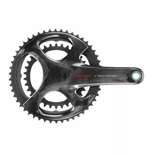 Campagnolo Super Record CT Titanium 11s krumtapaksættet – hule fuld carbon krumtapaksler – med integrerede titanium halvaksler – keramiske kuglelejer – kædehjul i letmetal, aluminiumsbolte – kræver ULTRA-TORQUE lejekopper – vægt: ca. 603g