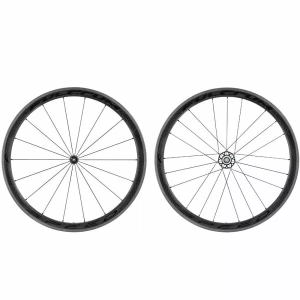 FULCRUM hjulsæt “Speed 40C C17” racing, til clincher dæk, fuld carbonfælg, 40mm fælghøjde, AC3 bremseflanke, dækbredde 25 til 50mm, carbon fornav med aluminiumsflange, aluminiumsbagnav med oversize flange på drivside, USB-kuglelejer, selvlåsende eger i rustfrit stål 2 / 1,5 / 2mm, VR 18 radial, HR 21: venstre 7 radial, højre 14 krydset, aluminiumnipler, friløbskasse med P.E.O. Belægning (HG), vægt 1420 g