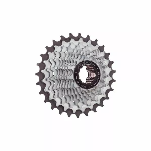 Miche kassette tandhjul “Light” 11-speed,, første og andet trin i mat forkromet stål, sidste tandhjul og slutmøtrik i aluminium 7075-T6. Passer til Shimano