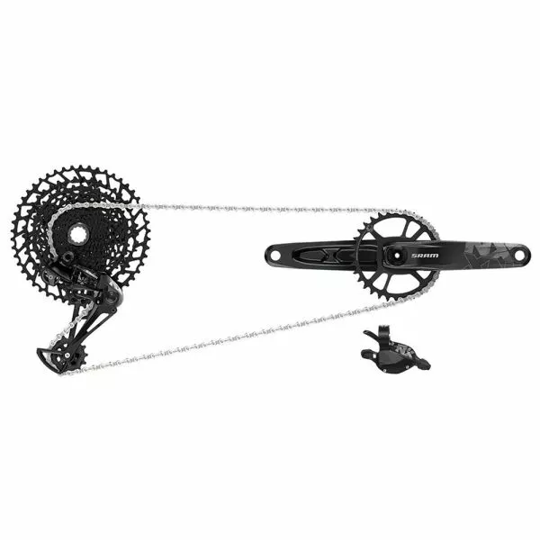 SRAM skiftende gruppesæt NX Eagle DUB – inklusive bagskifter, skiftegreb, krankboks, kæde, kassette, Chaingap Gauge monteringsværktøj.